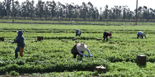 Fotografía donde aparecen unas personas mientras trabajan en un cultivo de cilantro, en Oxnard, California (EE.UU). Imagen de archivo. EFE/ Iván Mejía[ACOMPAÑA CRÓNICA: EEUU CORONAVIRUS]