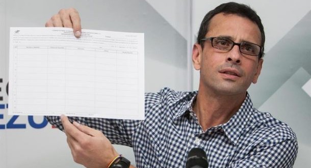 Capriles pidió que este 1 % sea colectado en solo «horas», aunque uno de los rectores del Poder Electoral, Luis Emilio Rondón dijo que la oposición cuenta con 30 días para conseguir estas casi 200.000 firmas.